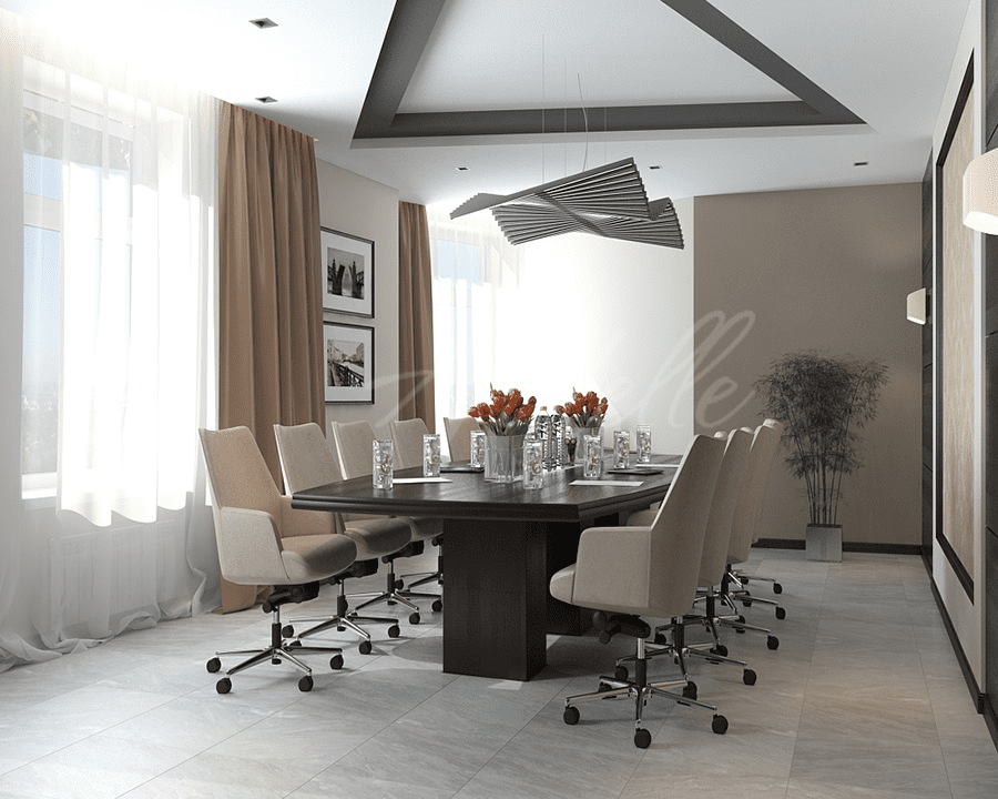 В зависимости от числа сотрудников, структуры фирмы или рода ее деятельности при проработке дизайна переговорной за основу берутся базовые типы комнат: