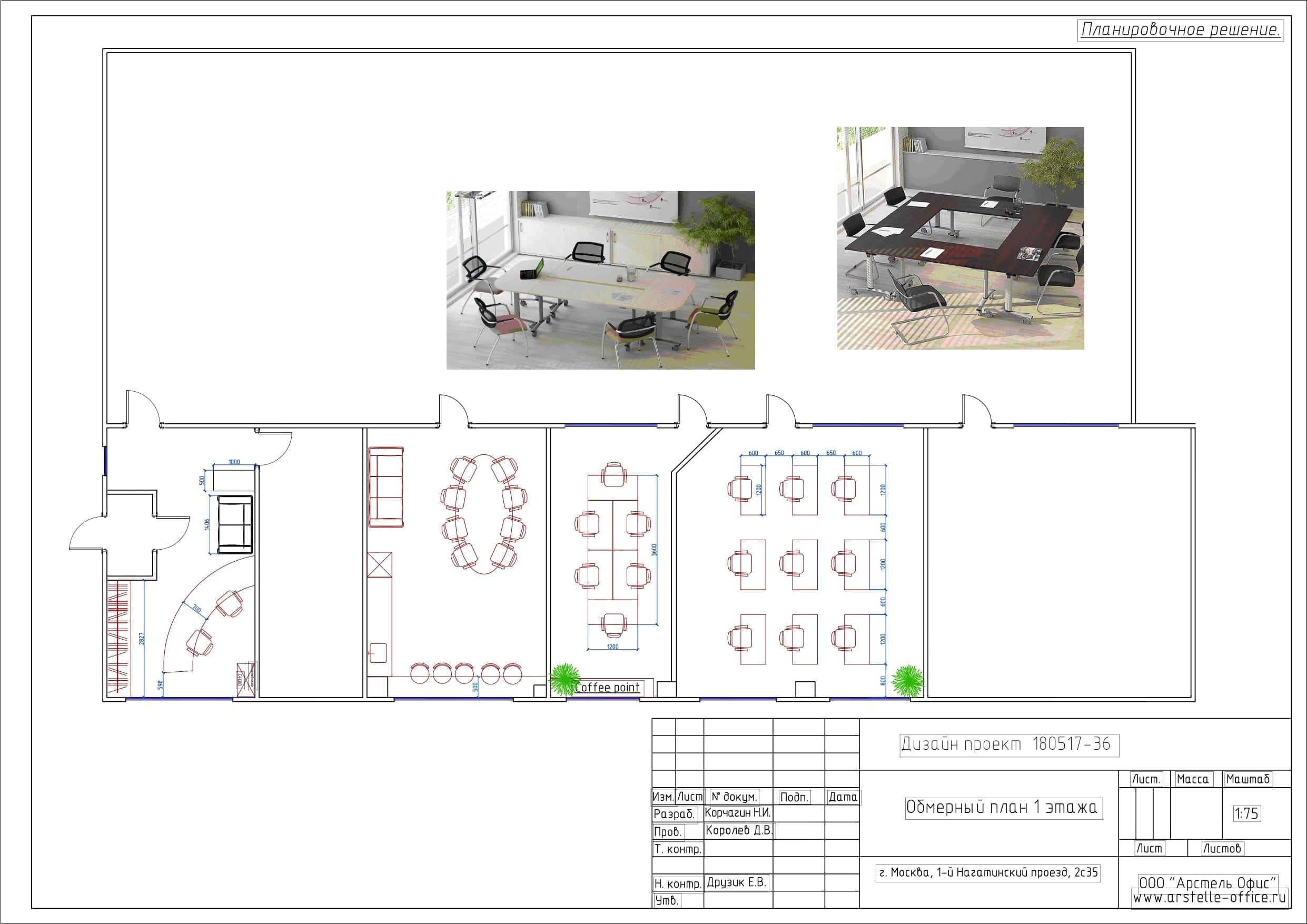 На первом этапе мы изучаем вашу компанию, количество отделов, особенности их взаимодействия друг с другом, а также проводим все необходимые замеры помещений. На основании результатов анализа формируется функциональное зонирование рабочих зон. После согласования компоновки предлагается первоначальное планировочное решение.