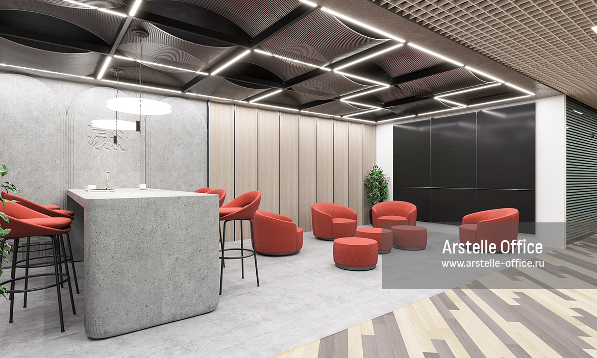 Дизайн интерьера офиса, арочными решениями отсылает к античной римской архитектуре. Предусмотрена зона отдыха, а также выставлены образцы продукции компании в зоне ресепшен.