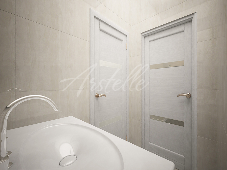 Комфорт сотрудников обеспечивает не только эргономика рабочих мест, но и продуманность дополнительных служебных помещений. Это санузел и комната для приготовления пищи. Они оформлены в простом минималистическом стиле в мягких бежевых тонах. Такое цветовое решение позволяет глазам сотрудника отдохнуть от чересчур резкого и холодного света в офисе. В кухне есть всё необходимое оборудование для хранения продуктов и приготовления ланча или обеда – двухкамерный холодильник, печь СВЧ, бытовая кофе-машина. Кухня не предназначена для приёма пищи – сотрудники обедают и пьют кофе на своих рабочих местах.