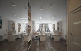 Современный дизайн офиса предполагает, что сотрудники утром будут с желанием приходить на работу, а вечером с сожалением уходить домой. Представленный проект вполне отвечает такому условию – офис удобен, функционален и соответствует всем нормам охраны труда.