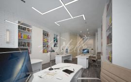 Представляем вашему вниманию современный дизайн офиса, расположенного в сравнительно небольшом помещении вытянутой прямоугольной формы. Окна есть лишь с одной стороны комнаты, результатом чего становится дефицит естественного дневного света. Для устранения этой проблемы мы сделали господствующим цветом помещения белый – в офисе белая мебель, стены и потолки. Контрастом служит лишь пол из светло-коричневого ламината, бежевые кресла и двери. Для освещения офиса применена светодиодная лента, смонтированная в виде прямоугольников и пересекающихся под прямым углом линий и накладные точечные светильники с энергосберегающими лампами. Оттенок света везде холодный, что подчёркивает официальный стиль помещения.